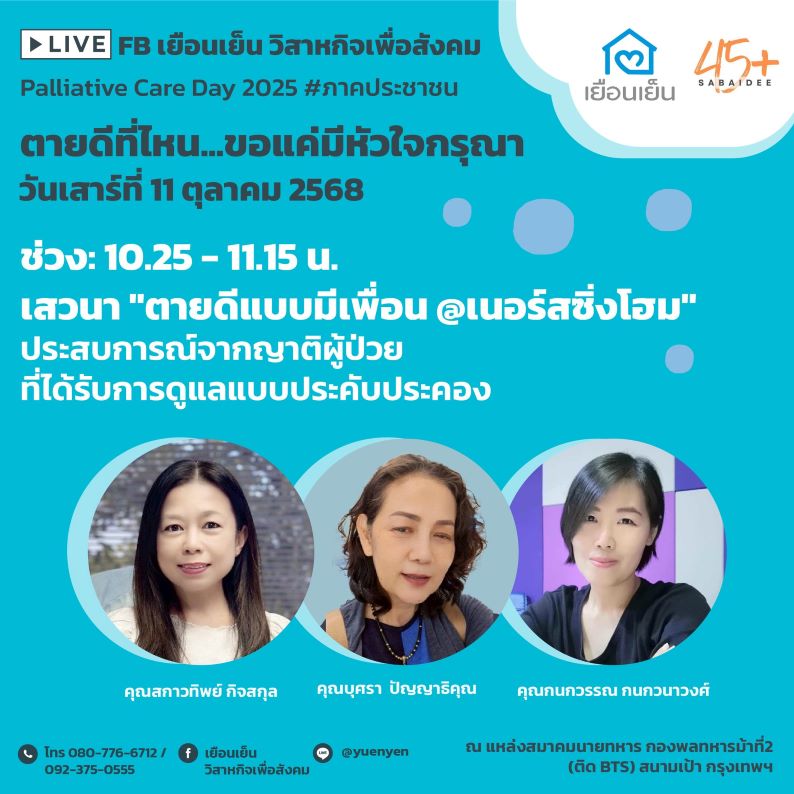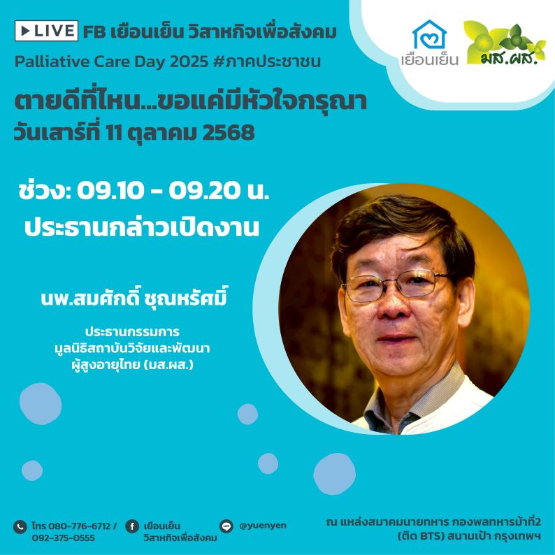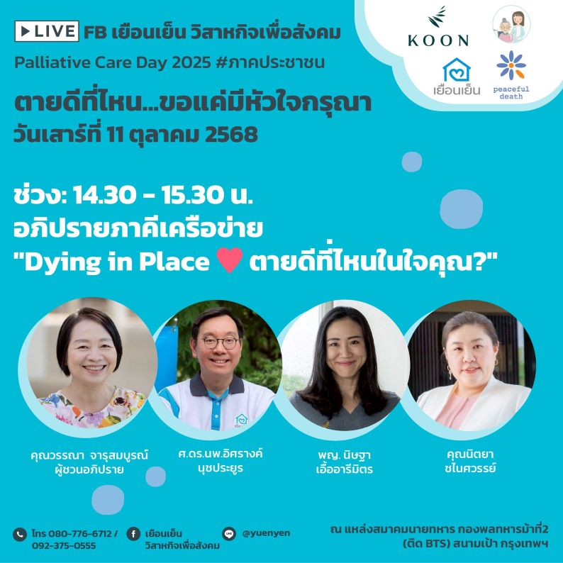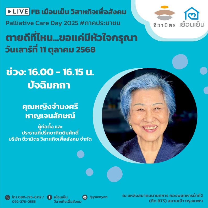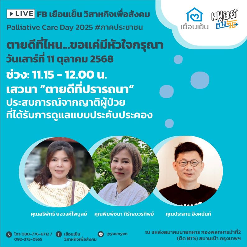 ในวันที่ 11 ตุลาคม 2568 เป็นวัน Palliative care day โลก เยือนเย็น วิสาหกิจเพื่อสังคม ร่วมกับภาคีเครือข่าย จัดงานเสวนา “Palliative care day 2025 #ภาคประชาชน” ตายดีที่ไหน…ขอแค่มีหัวใจกรุณา
