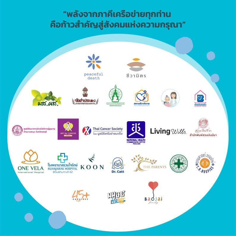 ชีวามิตรวิสาหกิจเพื่อสังคม มูลนิธิเครือข่ายชุมชนกรุณา เบาใจแฟมิลี่ อาร์ตฟอร์แคนเซอร์ สำนักงานสุขภาพแห่งชาติ เครือข่ายพุทธิกา มูลนิธิเครือข่ายมะเร็ง ศูนย์ธรรมศาสตร์ธรรมรักษ์ เอเชียเนอร์สซิ่งโฮม เดอะพาเร้นท์สเนอร์สซิ่งโฮม เรือนแก้วเนอร์สซิ่งโฮม โรงพยาบาลคูน